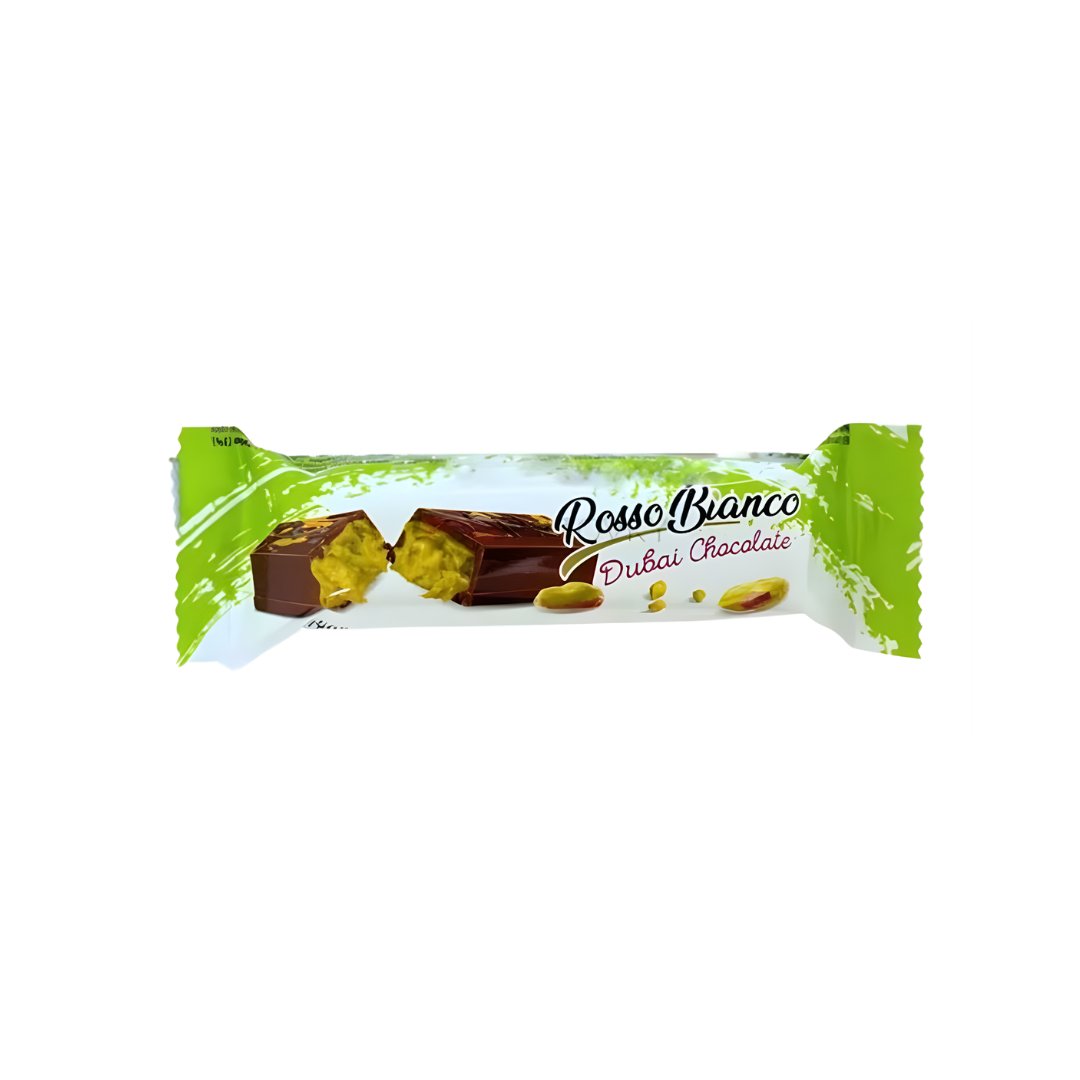 O Chocolate Rosso Bianco Dubai Pistache 35g é um chocolate premium que combina o sabor intenso do chocolate ao leite com pedaços crocantes de pistache, proporcionando uma experiência sofisticada e deliciosa. Ideal para lanches rápidos, sobremesas ou como presente especial.